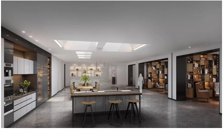 多功能區(qū)右邊有整塊玻璃,客人也可以看到外面的景觀,視野豁然開(kāi)朗。1.5米的平臺(tái)上設(shè)計(jì)了烹飪體驗(yàn)區(qū),并且通過(guò)可開(kāi)合的門與多功能區(qū)連通。這里不定期會(huì)舉行不同的聚會(huì)活動(dòng),成為感受建筑功能和氣氛的空間。