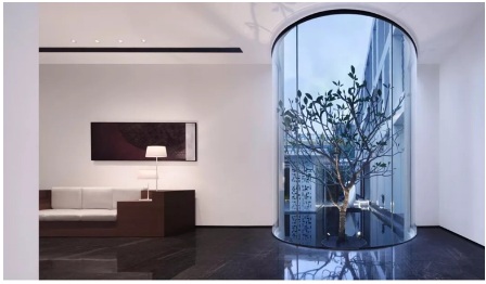 透過(guò)電梯廳的弧形玻璃,可看到戶外景觀樹(shù)。另外建筑頂部還開(kāi)了一些采光天井,使空間更有趣味,同時(shí)白天不再需要開(kāi)燈,節(jié)能環(huán)保。下午三點(diǎn)左右是天井下光影效果最豐富的時(shí)候,也正是客人到達(dá)的合適時(shí)間。