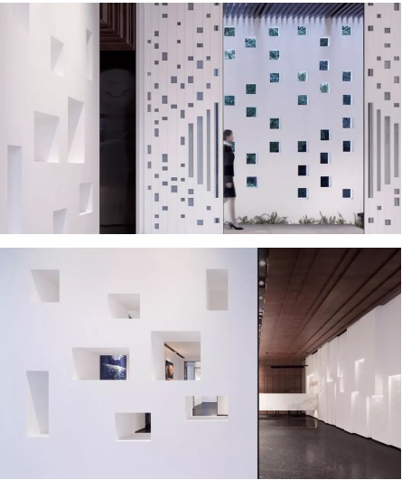 接待廳右邊是灰空間長(zhǎng)廊,回頭通過(guò)一些洞口看到外面的景色。外面從洞口可以看到里面的藝術(shù)品局部,引起人的參觀欲望。藝術(shù)品定期更換,變化豐富。