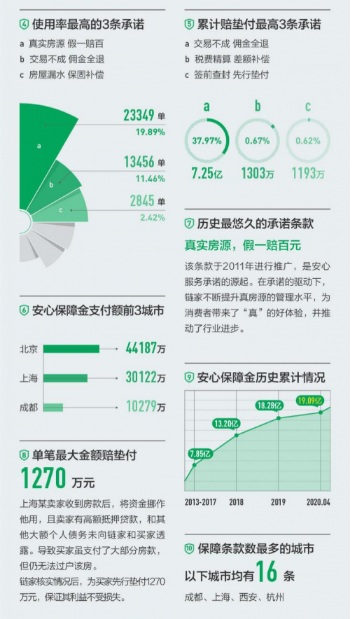 統(tǒng)計(jì)顯示,“真實(shí)房源假一賠百”、“交易不成傭金全退”、“房屋漏水保固補(bǔ)償”是使用率最高的三項(xiàng)承諾,分別為19.89%、11.46%和2.42%;“交易不成傭金全退”、“稅費(fèi)精算差額補(bǔ)償”和“簽前查封先行墊付”是累計(jì)賠墊付金額最高的三條承諾,分別為7.25億、1303萬和1193萬。