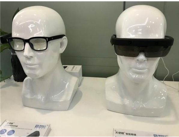 產業(yè)園另一家人工智能計算機視覺芯片設計公司上海肇觀電子科技有限公司的一面墻上掛滿了企業(yè)獲得的中外專利證書。公司研發(fā)的兩副眼鏡讓人眼界大開!疤焓寡廴斯ぶ悄荛喿x神器”可以用眼鏡上的攝像頭將拍到的文字轉化為語音,幫助視障人士閱讀文字和辨識貨幣。另一副“天使眼智能眼鏡”是基于計算機視覺和人工智能技術的感知設備,相當于機器人的眼睛,能夠輔助視障人士出行和感知世界。