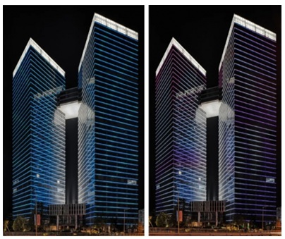 HDA項目經(jīng)理羅文秀介紹:“雙子塔橫向RGBW燈具與建筑完美結(jié)合,并使用了DMX512智能燈光控制系統(tǒng),達成豐富又理想的場景控制。近期團隊在做節(jié)能態(tài)的多媒體立面創(chuàng)作,希望將來建筑光影能呈現(xiàn)更具藝術(shù)效果的內(nèi)容,雙子塔優(yōu)雅、動感的光環(huán)境屆時將呈現(xiàn)更多令人贊嘆的風(fēng)景。雙子塔燈光設(shè)計的一個難點,在于從塔下平臺直接打亮100米以上空中連廊的燈光。距離超過100米,燈具的價格又必須合理控制,經(jīng)過幾輪試驗挑選,最后我們選擇了四盞傳統(tǒng)光源、窄光束的投光燈完成了這個艱巨的任務(wù)。除了選擇最恰當(dāng)?shù)臒艟,要實現(xiàn)這個難度很高的打亮的話,燈具打光角度的設(shè)計必須非常精確,其安裝、調(diào)試的要求也非常高,需要整個項目團隊的密切配合。”