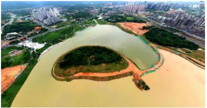 暴雨襲擊下,知識(shí)城鳳凰湖湖水渾濁不堪。而在建中的九龍湖,經(jīng)一夜暴雨后水位大漲,現(xiàn)已蓄滿,連觀光連廊也已淹沒。九龍湖湖中小島及過島通道,將湖水隔成了兩個(gè)世界,涇渭分明:南側(cè)較清,北側(cè)渾濁,儼然一副太極圖。