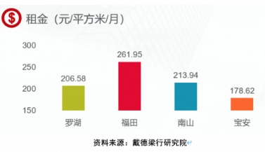戴德梁行數(shù)據(jù)顯示,羅湖區(qū)的需求持續(xù)外流,再加上個(gè)別商務(wù)空間運(yùn)營商租約到期,空置率達(dá)到14.98%,租金則下降至每月每平方米206.58元。福田區(qū)也在市場競爭加劇背景下租金下降至每月每平方米261.95元,空置率為16.04%。而南山區(qū)的空置率上行至34.85%,租金同樣下降至每月每平方米213.94元。