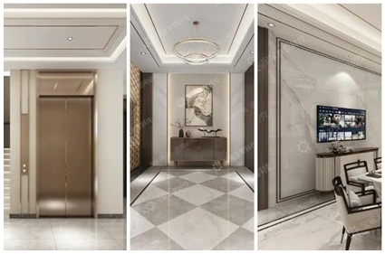 邊長1.2米德系電梯、堂屋拼花地板、餐廳大巖板背景墻