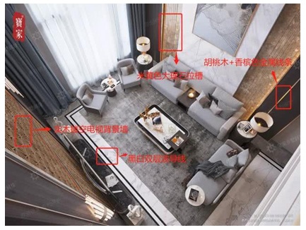 客廳地磚由拋光磚升級為大理石通體磚,主色調(diào)優(yōu)雅爵士白+意大利灰,黑白雙層波導(dǎo)線。沙發(fā)背景墻兩側(cè)米黃大理石拉槽;胡桃木飾面+香檳色金屬線條,營造一種優(yōu)雅略帶傲慢的氛圍,主人生活品味與審美的無聲表達(dá)