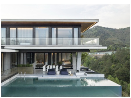 圍坐在戶外混凝土下沉式圍爐區(qū),嵌入自然中去,傾聽耳畔的流水,感受躍動(dòng)的火光。建筑和室內(nèi)的關(guān)系、局部和整體之間、人與自然交融無間。透明懸空的泳池,似一個(gè)晶瑩的藍(lán)水晶漂浮在山間,黑夜池底部閃耀點(diǎn)狀燈光,有如水中繁星,遙應(yīng)星際宇宙的廣博。