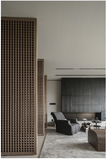 設(shè)計(jì)中一層主客廳的開闊的結(jié)構(gòu),讓空間溶解于天地自然之中,其間穿插木格柵為空間梳理視線。