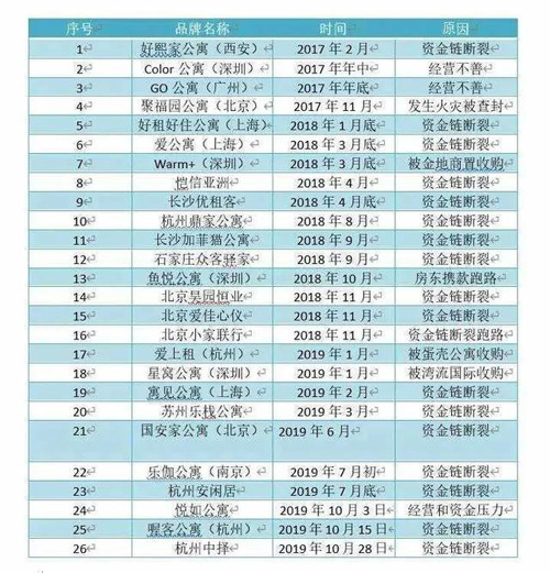 根據網上流傳的一份倒閉名單,2017年有4家長租公寓品牌倒閉,而到2018年又有12家因資金鏈鍛煉而退出,其中甚至還有魚悅公寓這樣房東攜款跑路的極端個案存在。