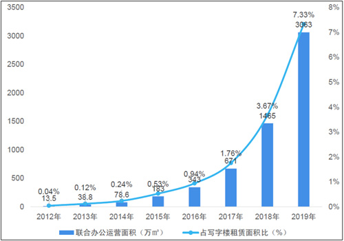 圖表 2012-2019年中國聯(lián)合辦公運(yùn)營面積及占比