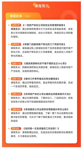 據(jù)悉,此次課程包括《這樣高效的業(yè)務(wù)管理,你還不知道》、《提高客戶轉(zhuǎn)化的三要素》、《業(yè)主的小心思你都懂嗎?》、《有效帶看》、《業(yè)務(wù)報(bào)表制作》、《經(jīng)營(yíng)數(shù)據(jù)分析》、《如何述職?》共計(jì)七堂大課,培訓(xùn)跨度一個(gè)月,預(yù)計(jì)該課程將推動(dòng)100家中小經(jīng)紀(jì)企業(yè)完成數(shù)字化轉(zhuǎn)型,實(shí)現(xiàn)房產(chǎn)經(jīng)紀(jì)科技化的深度應(yīng)用,促進(jìn)新型房產(chǎn)經(jīng)紀(jì)人才職業(yè)化培養(yǎng)。