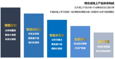博志成地產(chǎn)學(xué)堂課經(jīng)過(guò)不斷完善升級(jí),已經(jīng)逐步形成了領(lǐng)跑計(jì)劃、專項(xiàng)訓(xùn)練營(yíng)、專題系列課、主題課程及合作課程五大線上產(chǎn)品體系。