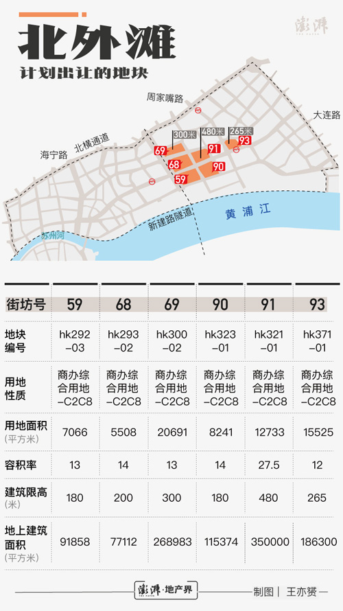 480米高樓所在的91街坊,占地面積1.2733萬平方米,容積率達到27.5,地上建筑面積為35萬平方米。69街坊地塊上計劃建造的300米高大樓,占地面積為2.0691萬平方米,容積率為13,地上建筑面積約26.8983萬平方米。緊鄰提籃橋地鐵站旁的93街坊地塊將會新建一棟265米高的大樓,用地面積約1.5525萬平方米,地上建筑面積達到18.63萬平方米。