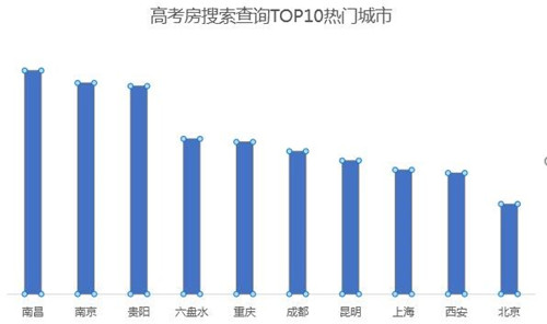 從同程旅行平臺上入住日期在7月6-9日之間的考點(diǎn)周邊酒店搜索量來看,南昌、南京、貴陽、六盤水、重慶、成都、昆明、上海、西安、北京10個(gè)城市的“高考房”搜索量目前為止位居全國前列,前十名非一線城市占比超過一線城市。