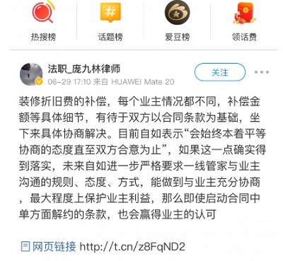 一些業(yè)主對(duì)自如提出的裝修費(fèi)用及裝置設(shè)施的補(bǔ)償感到不理解。知名律師龐九林了解此事后,建議自如應(yīng)該做好溝通管理,以合同條款為基礎(chǔ),柔性化解決此事。
