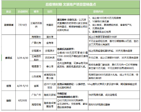 從活動時間來看,往往橫跨假期或選擇周末。多數(shù)開發(fā)商活動時間跨度較長,上半年有房企的活動持續(xù)了3個月的時間,覆蓋了清明節(jié)、勞動節(jié)和端午節(jié)。版納悅景莊除了選擇在周末進行一場高潮直播,也配合進行了暑期等營銷活動,更能傳遞休閑輕松的氛圍,符合文旅地產(chǎn)定位。