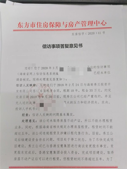海南東方市住房保障與房產(chǎn)管理中心則向業(yè)主們回復(fù):“該公司未取得房屋不動產(chǎn)證,所以不能辦理租賃業(yè)務(wù)。同時根據(jù)海南省相關(guān)規(guī)定辦理房屋租賃,租賃時間不能超過5年,該公司違規(guī)租賃及涉嫌以租代售行為!