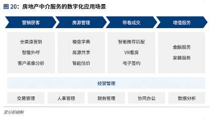 房地產(chǎn)中介服務(wù)機(jī)構(gòu)的數(shù)字化轉(zhuǎn)型,核心是圍繞中介服務(wù)業(yè)務(wù)的營銷獲客、房源管理、帶看成交和增值服務(wù)等全流程,通過數(shù)字化應(yīng)用提升業(yè)務(wù)效率和客戶體驗(yàn)。例如,在營銷獲客端,順應(yīng)交易線上化的趨勢(shì),除了傳統(tǒng)的電銷和信息平臺(tái)廣告以外,積極布局社交媒體、微信小程序等線上營銷渠道,并基于線上營銷的數(shù)據(jù)沉淀提升客戶洞察能力。在帶看成交等服務(wù)環(huán)節(jié),通過VR看房、電子簽約等線上交易技術(shù)應(yīng)用提升交易效率和客戶體驗(yàn)。