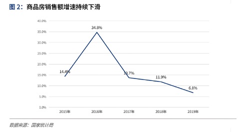 一方面,由于以“房住不炒”為基調(diào)的房地產(chǎn)調(diào)控政策的作用和市場(chǎng)需求總量的下滑,房地產(chǎn)開發(fā)業(yè)務(wù)的增速和利潤率都處于下行周期。2019年,全國商品房銷售額約16萬億元,增速從2018年的11.9%下滑到6.8%。受到COVID-19疫情對(duì)上半年銷售的影響,2020年的市場(chǎng)增速預(yù)期也并不樂觀,預(yù)計(jì)銷售額增速將進(jìn)一步下滑。