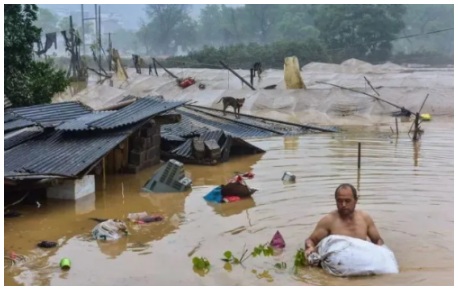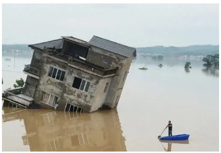 △ 被洪水淹沒的家,房體損壞,傾斜在水中