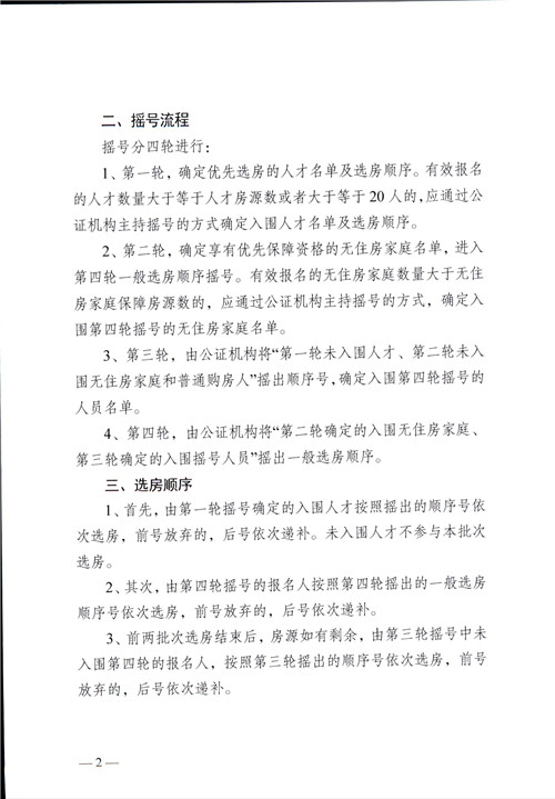 第二輪,確定享有優(yōu)先保障資格的無住房家庭名單,進入第四輪一般選房順序搖號。有效報名的無住房家庭數(shù)量大于無住房家庭保障房源數(shù)的,應通過公證機構主持搖號的方式,確定入圍第四輪搖號的無住房家庭名單。