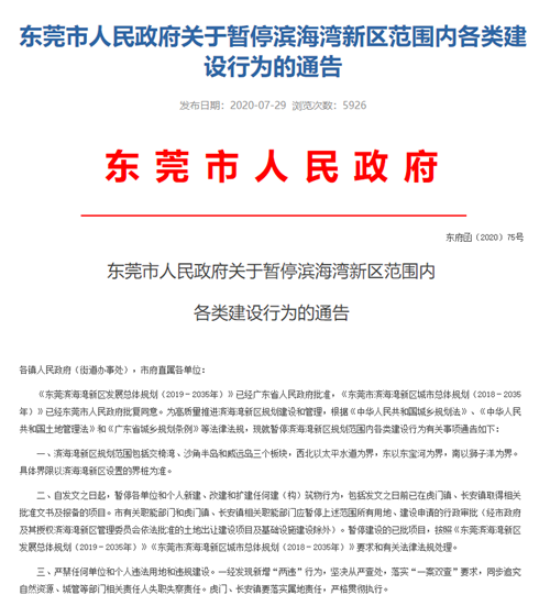 7月29日,東莞市政府發(fā)布《東莞市人民政府關(guān)于暫停濱海灣新區(qū)范圍內(nèi)各類建設(shè)行為的通告》,嚴禁任何違建,暫停濱海灣新區(qū)規(guī)劃范圍內(nèi)所有用地、建設(shè)申請的行政審批,包括發(fā)文之日前已取得相關(guān)批準文書及報備的項目。