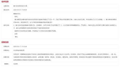 有市民向《市長(zhǎng)信箱》投訴說(shuō),嚴(yán)控房?jī)r(jià)之下,長(zhǎng)沙富興時(shí)代御城項(xiàng)目去年在政府部門備案價(jià)格16000元/平方米沒(méi)有通過(guò),為何今年報(bào)19000元/平方米反而通過(guò)了?對(duì)此,長(zhǎng)沙市住建局回復(fù)稱,各級(jí)政府價(jià)格主管部門是商品房明碼標(biāo)價(jià)的管理機(jī)關(guān),依法對(duì)商品房經(jīng)營(yíng)者執(zhí)行明碼標(biāo)價(jià)和收費(fèi)公示規(guī)定的情況進(jìn)行監(jiān)督檢查。