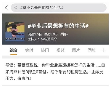 在#畢業(yè)后最想擁有的生活#話題下,媒體也從就業(yè)、租房、結(jié)婚三大維度,發(fā)起了“畢業(yè)去哪里發(fā)展?”、“剛畢業(yè)選合租還是整租?”、“接受租房結(jié)婚嗎?”調(diào)查,共吸引近4000名畢業(yè)生共同參與。