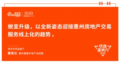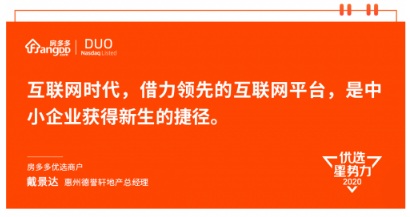 2017年戴景達(dá)第一次與房多多接觸,“房多多在惠州交易服務(wù)平臺(tái)中占據(jù)領(lǐng)導(dǎo)位置,擁有非常強(qiáng)的技術(shù)和品牌,對(duì)合作商戶同時(shí)能給予充分的尊重和成長(zhǎng)幫助。對(duì)于我們想要自由發(fā)展的中小房地產(chǎn)公司來(lái)說(shuō),是非常好的合作伙伴。” 戴景達(dá)經(jīng)過(guò)多方了解后給出了這樣的評(píng)價(jià),隨即與房多多開(kāi)啟了長(zhǎng)期合作之旅。