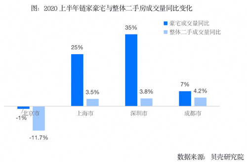 與同期普通二手住宅市場表現(xiàn)相比,上半年豪宅市場也是“火熱”,北上深蓉等城市上半年豪宅成交量同比均高于整體二手房市場。