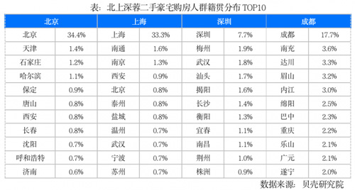 此外,從購房人群的籍貫統(tǒng)計(jì)看,豪宅購房人群多來自于本市及周邊縣市,但各城市又略有不同。深圳作為近年來外地人大舉遷入的城市,豪宅購房人群中本地人占比最低;而豪宅市場已發(fā)展多年且門檻較高的北京、上海,本地人占比最高;成都作為區(qū)域中心城市,吸引周邊縣市人群購房的占比遠(yuǎn)高于北上深。