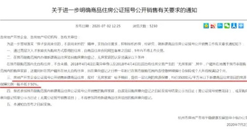 記者查閱了7月2日杭州市出臺(tái)的《關(guān)于進(jìn)一步明確商品住房公證搖號(hào)公開銷售有關(guān)要求的通知》,其中第四條明確規(guī)定:“報(bào)名參加我市限購范圍內(nèi)新建商品住房公正搖號(hào)公開銷售的購房家庭,自該項(xiàng)目購房意向登記之日起至搖號(hào)結(jié)果公示當(dāng)日止,或至購房意向登記結(jié)果公示當(dāng)日止,不得參加其他新建商品住房項(xiàng)目的購房意向登記!