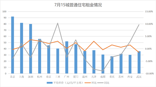 觀點指數(shù)重點監(jiān)測租賃熱門的15個城市發(fā)現(xiàn),7月15城平均住房租金均價為47.77元/平方米/月;整體租金較上月有小幅度回升,單月平均環(huán)比增速為0.91%。值得注意的是,本月15城住房租金均價環(huán)比下跌0.4%。