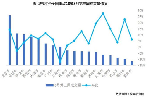 房訊網(wǎng)訊 據(jù)貝殼研究院數(shù)據(jù),8月第三周租賃市場成交量相比8月第二周環(huán)比上漲6.9%。分城市來看,8月全國重點18城租賃成交量普遍上漲,其中大連及廊坊市漲幅超過20%,合肥、青島、濟南、北京及南京市漲幅突破10%。