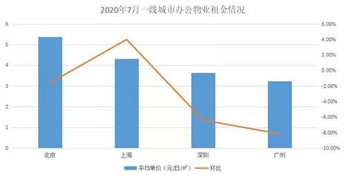 數(shù)據(jù)顯示,北京辦公物業(yè)租金水平最高,為5.37元/日/平方米,較上月下跌1.6%;上海辦公物業(yè)租金水平4.31元/日/平方米,環(huán)比小幅上漲3.98%;深圳、廣州辦公物業(yè)租金進(jìn)一步下跌,其中廣州最為明顯,較上月跌幅達(dá)8.18%。