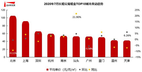 7月長租公寓(普通公寓)全國城市租金走勢整體呈上升趨勢,其中北京、上海、深圳、杭州和南京的月度租金分別為105.13元/月/㎡、91.36元/月/㎡、65.98元/月/㎡、59.57元/月/㎡和54.49元/月/㎡。環(huán)比中,天津42.66元/月/㎡增幅最大6.26%,同比中,汕頭53.07元/月/㎡增幅最大為21.90%,京津和大灣區(qū)仍然值得關注。