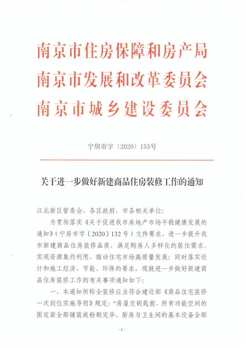 根據(jù)江蘇省南京市住房保障和房產(chǎn)局8月27日的消息,8月14日起,南京市已實(shí)施由南京市住房保障和房產(chǎn)局、南京市發(fā)展和改革委員會(huì)和南京市城鄉(xiāng)建設(shè)委員會(huì)聯(lián)合出臺(tái)的《關(guān)于進(jìn)一步做好新建商品住房裝修工作的通知》。