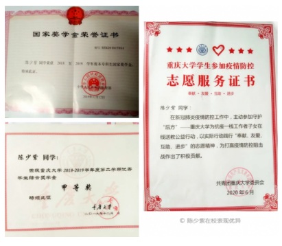 大學(xué)期間的陳少紫,學(xué)習(xí)成績(jī)依舊名列前茅,并積極投身到學(xué)校和班級(jí)的管理工作,在今年抗擊新冠疫情期間她主動(dòng)請(qǐng)纓成為志愿者老師,目前是預(yù)備黨員的她,正為成為正式黨員而努力。