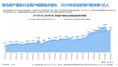 同時(shí)移動(dòng)互聯(lián)網(wǎng)推動(dòng)了房產(chǎn)行業(yè)線上服務(wù)的能力,促使房產(chǎn)行業(yè)在包括交易、租賃、家裝、物業(yè)等領(lǐng)域在內(nèi)的服務(wù)逐步觸網(wǎng),2017年以來,移動(dòng)房產(chǎn)服務(wù)所覆蓋的用戶規(guī)模從2700多萬增長到1億大關(guān)。