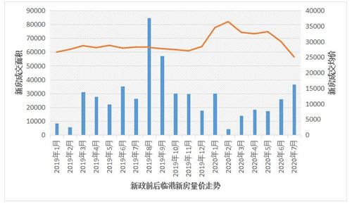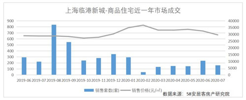 按照58安居客房產(chǎn)研究院數(shù)據(jù),2019年8月受自貿(mào)區(qū)政策影響,臨港新房單月銷售套數(shù)達(dá)835套,而后銷量持續(xù)回落,至2020年2月達(dá)到最低點(diǎn)。到今年二季度,市場(chǎng)整體復(fù)蘇推動(dòng)下銷量有了一定恢復(fù),但今年最高單月銷量?jī)H235套,依然低于去年8月-12月的最低銷量。同時(shí)新房?jī)r(jià)格也呈現(xiàn)沖高回落,今年7月均價(jià)跌破3萬(wàn)元/平方米大關(guān)。