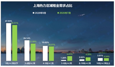 在2020年8月的辦公租賃市場中,租金在3元/㎡·天以下的辦公項目依舊是各熱門區(qū)域最受關(guān)注的目標,需求占比達到47.93%,環(huán)比7月份有所上升,徐匯和浦東是當月這個租金段最受關(guān)注的區(qū)域;而8元/㎡·天以上的高端辦公項目需求占比僅有5.63%,環(huán)比7月份再度出現(xiàn)下滑,當月能承受高昂租金的客戶更青睞把尋址目標放在靜安、黃浦和浦東。