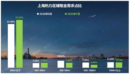 8月份熱門區(qū)域在租賃戶型面積的需求上,200平方米以下的小戶型需求占比為65.98%,環(huán)比7月份有所下滑,浦東和閔行是這個戶型段最受關(guān)注的區(qū)域;而1000平方米以上的大戶型需求占比為8.36%,環(huán)比7月份有所上升,閔行和長寧則是這個戶型段最受關(guān)注的區(qū)域。