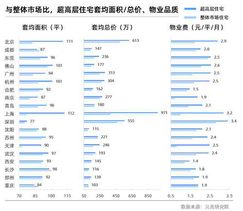 貝殼研究院數(shù)據(jù)顯示,超高層住宅通常具有中高端物業(yè)屬性,與整體市場相比,大部分城市超高層住宅具有凸出的優(yōu)勢:更高的居住品質(zhì)、更佳的地理位置。