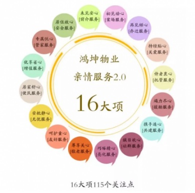 隨著市場(chǎng)和行業(yè)的不斷變化,品牌的重要性日益凸顯。鴻坤物業(yè)自成立17年以來(lái),始終用謙卑的態(tài)度做好服務(wù),秉承“讓人們住的開(kāi)心”的企業(yè)使命,用專業(yè)、主動(dòng)、熱情、勤奮、用心和迅捷為業(yè)主打造“有家、有愛(ài)、有生活”的和美社區(qū)。鴻坤物業(yè)堅(jiān)持“客戶導(dǎo)向”,開(kāi)創(chuàng)獨(dú)有的“親情服務(wù)體系”,在運(yùn)營(yíng)的2年中,不斷改進(jìn),目前形成了“親情服務(wù)體系2.0”。通過(guò)精細(xì)化的物業(yè)管理,以客戶社區(qū)生活活動(dòng)為線索,從場(chǎng)景、事件和管家三個(gè)維度切入模擬與業(yè)主每一個(gè)可能的接觸點(diǎn),提煉出16大項(xiàng),27個(gè)服務(wù)觸點(diǎn)、115個(gè)關(guān)注點(diǎn),并對(duì)每個(gè)觸點(diǎn)量化了重點(diǎn)服務(wù)標(biāo)注和常規(guī)服務(wù)標(biāo)準(zhǔn)。始終用心、用情服務(wù)。