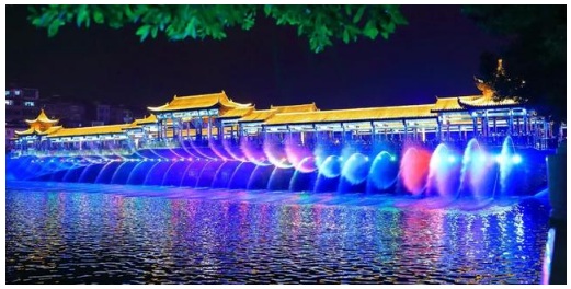 伴隨著一曲悠揚的《春江花月夜》,全南解放橋七彩光韻流轉(zhuǎn)、陣陣樂聲流淌,璀璨的燈光如夢似幻,照亮飛檐翹角、雕花木窗,整個廊橋宛若長虹臥波,又似蛟龍出水。