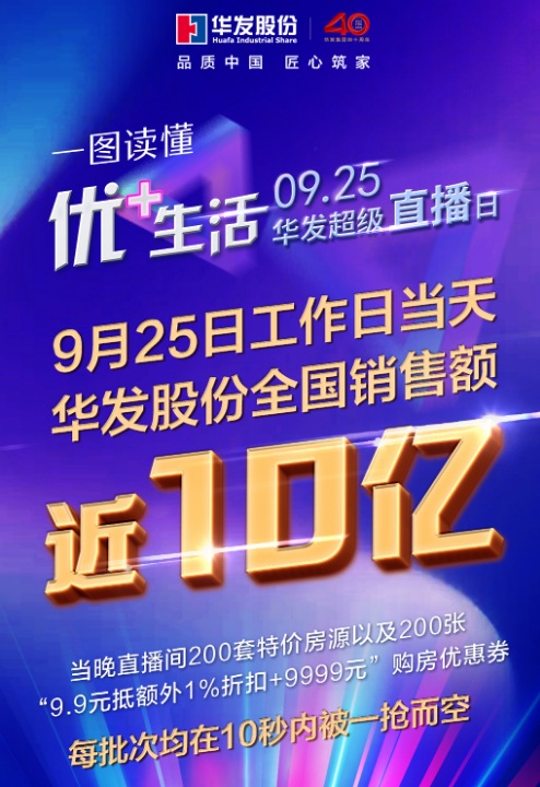 9月25日晚,華發(fā)股份抖音直播首秀——“華發(fā)超級(jí)直播日”拉開帷幕。這場(chǎng)由當(dāng)紅明星、華發(fā)股份高管及普通員工跨界合作的超級(jí)“帶貨”直播活動(dòng),累計(jì)觀看量達(dá)160余萬(wàn)人次。直播當(dāng)晚約兩小時(shí)內(nèi),共分5批次推出的200套秒殺房源及200張“9.9元抵額外1%折扣+9999元”的購(gòu)房?jī)?yōu)惠券,每批次均在10秒內(nèi)被一搶而空。在話題的持續(xù)帶動(dòng)下,25日工作日當(dāng)天,華發(fā)股份全國(guó)共實(shí)現(xiàn)銷售額近10億元。