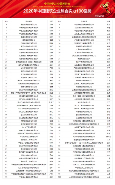 近日,2020年《中國建筑企業(yè)綜合實力100強(qiáng)》暨《中國50家最佳建筑承包商》排行榜發(fā)布,這是中國建筑企業(yè)管理協(xié)會對中國建筑業(yè)進(jìn)行全面、科學(xué)、獨立的企業(yè)實力發(fā)展調(diào)查研究宣傳發(fā)布工作。通過對超過6000家利潤總額在8000萬元至420億元之間的中國大陸建筑施工、勘察設(shè)計、工程監(jiān)理等中國建筑企業(yè)進(jìn)行了數(shù)據(jù)采集研究,基于對財務(wù)分析、行業(yè)分析、市場占有率分析確定候選企業(yè),邀請100位企業(yè)高管、學(xué)者及官員對經(jīng)資格審核符合要求的企業(yè)進(jìn)行評選,比照國際上通行的做法,根據(jù)營業(yè)收入、資產(chǎn)總額、利潤總額、資信等級、社會貢獻(xiàn)、業(yè)主滿意度等指標(biāo)對候選企業(yè)進(jìn)行綜合評分排序,并對部分候選企業(yè)進(jìn)行實地拜訪,從中遴選出100家中國建筑企業(yè)綜合實力100強(qiáng)企業(yè)及50家中國50家最佳建筑承包商企業(yè)。在此基礎(chǔ)上通過與世界500強(qiáng)企業(yè)進(jìn)行綜合對比分析,進(jìn)而有針對性地提出促進(jìn)企業(yè)做強(qiáng)做大做久的策略建議,在全國范圍內(nèi)形成了巨大的社會影響力。