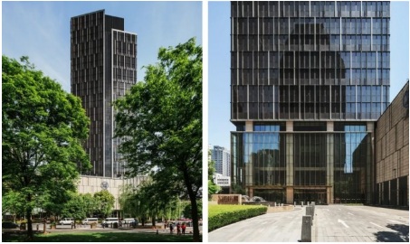 一期建筑采用經(jīng)典的ArtDeco風(fēng)格,而二期建筑由國(guó)際頂尖事務(wù)所KPF完成設(shè)計(jì),為現(xiàn)代風(fēng)格。建筑的玻璃幕則以石庫(kù)門窗扇為意向,變化出富有裝飾性的、靈動(dòng)活潑的豎向構(gòu)件。遠(yuǎn)遠(yuǎn)望去,企業(yè)天地5號(hào)的裙樓和塔樓形成了黑灰白三種層次的立面效果,但采用相似的豎向比例,因而顯得既整體也有細(xì)節(jié)。