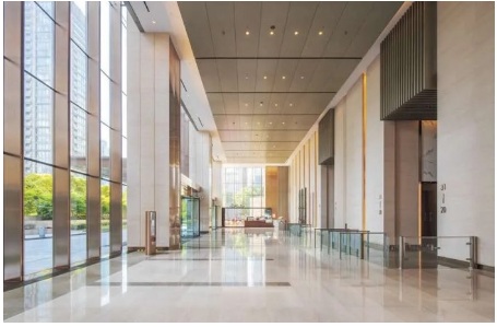 走進(jìn)入口大堂,便能發(fā)現(xiàn)室內(nèi)設(shè)計(jì)簡(jiǎn)潔大方,淡雅明快,別具一格,反映出了新時(shí)代的審美。辦公大堂區(qū)挑高達(dá)9米,視野開闊無(wú)阻隔,通透的大面積的落地玻璃,又將室外的湖光綠樹引入眼簾。