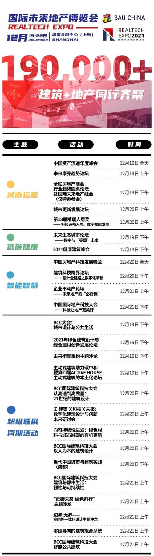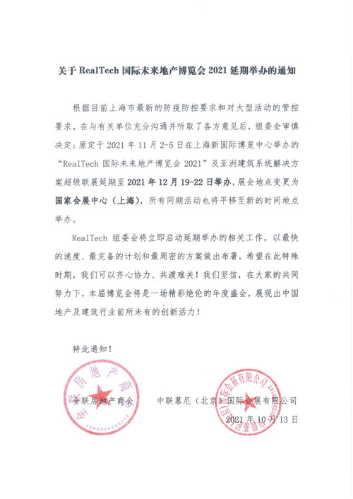 根據(jù)目前上海市最新的防疫防控要求和對(duì)大型活動(dòng)的管控要求,在與有關(guān)單位充分溝通并聽取了各方意見后,組委會(huì)審慎決定:原定于2021年11月2-5日在上海新國際博覽中心舉辦的“RealTech國際未來地產(chǎn)博覽會(huì)2021”及亞洲建筑系統(tǒng)解決方案超級(jí)聯(lián)展延期至2021年12月19-22日舉辦,展會(huì)地點(diǎn)變更為國家會(huì)展中心(上海),所有同期活動(dòng)也將平移至新的時(shí)間地點(diǎn)舉辦。